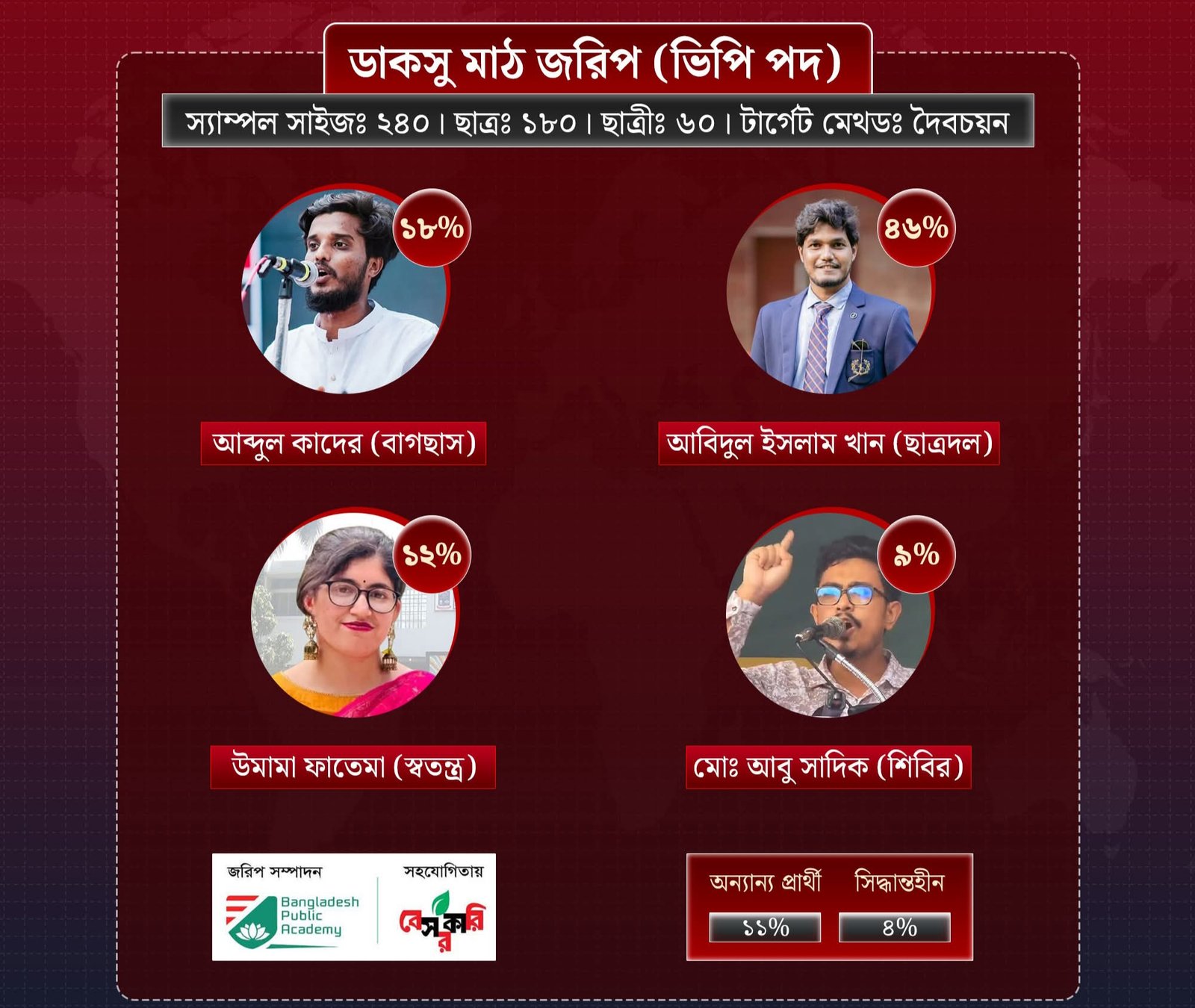 এতে বলা হয়েছে, দৈবচয়ন পদ্ধতিতে এটি পরিচালনা করা হয়েছে। এতে ১৮০ জন ছাত্র ও ৬০ জন ছাত্রী অংশ নিয়েছেন। তাদের ভোটের ভিত্তিতে ভিপি পদে সবচেয়ে এগিয়ে রয়েছেন ছাত্রদল সমর্থিত প্যানেলে প্রার্থী আবিদুল ইসলাম খান, তার জনপ্রিয়তা রয়েছে ৪৬ শতাংশ। দ্বিতীয় অবস্থানে রয়েছেন আব্দুল কাদের, তার জনপ্রিয়তা ১৮ শতাংশ। তৃতীয় অবস্থানে রয়েছেন স্বতন্ত্র প্রার্থী উমামা ফাতেমা, তার জনপ্রিয়তা রয়েছে ১২ শতাংশ। এরপর রয়েছেন আবু সাদিক কায়েম, তার জনপ্রিয়তা ৯ শতাংশ।