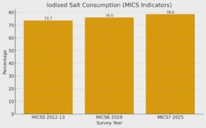 আয়োডাইজড লবণ ব্যবহারে দেশের অগ্রগতি সাম্প্রতিক বছর গুলোতে কার্যত স্থবির হয়ে পড়েছে বলে ইঙ্গিত দিচ্ছে বাংলাদেশ পরিসংখ্যান ব্যুরো (BBS) প্রকাশিত সর্বশেষ (নভেম্বর ২০২৫) MICS7 জরিপের প্রাথমিক প্রতিবেদনের তথ্য।