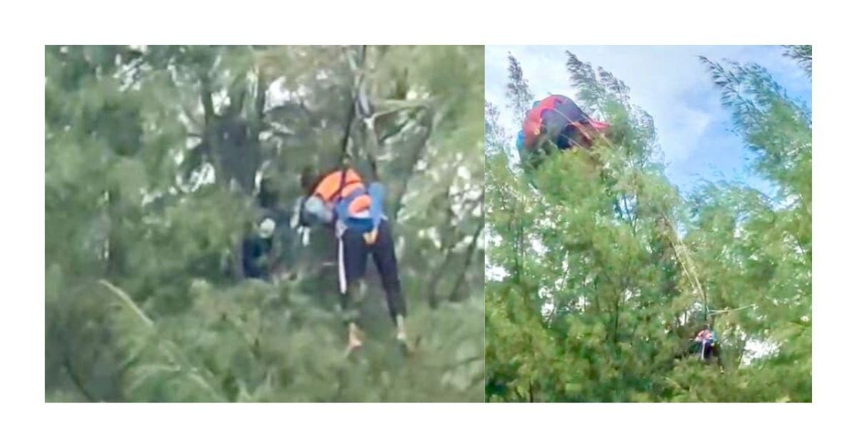 ঘটনার প্রত্যক্ষদর্শী আল আমিন নামে স্থানীয় এক যুবক বলেন, ‘ তিনি অনেকক্ষণ যাবত গাছে ঝুলেছিলেন, অবস্থা দেখে মনে হচ্ছিলো পড়ে যেতে পারেন। পরে প্যারাসেলিংয়ের লোকজন তাকে নিচে নামিয়ে আনেন, এসময় তাকে আতংকিত মনে হচ্ছিলো।’