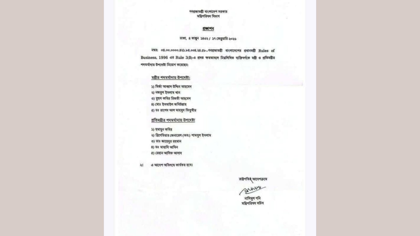 দলীয় সূত্রে জানা গেছে, কুমিল্লা-১১ (চৌদ্দগ্রাম) আসন থেকে নির্বাচিত সংসদ সদস্য ডা. সৈয়দ আব্দুল্লাহ মোহাম্মদ তাহেরকে বিরোধী দলীয় উপনেতার দায়িত্ব দেওয়া হয়েছে। অন্যদিকে বৈষম্যবিরোধী ছাত্র আন্দোলনের অন্যতম সমন্বয়ক ও জাতীয় নাগরিক পার্টির আহ্বায়ক নাহিদ ইসলামকে বিরোধী দলীয় চিফ হুইপ হিসেবে বেছে নেওয়া হয়েছে।