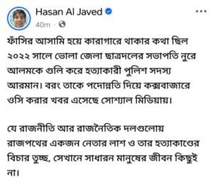 এপ্রসঙ্গে সাংবাদিক হাসান আল জাবেদ তার ফেসবুকে লিখেন, ‘ ফাঁসির আসামি হয়ে কারাগারে থাকার কথা ছিল