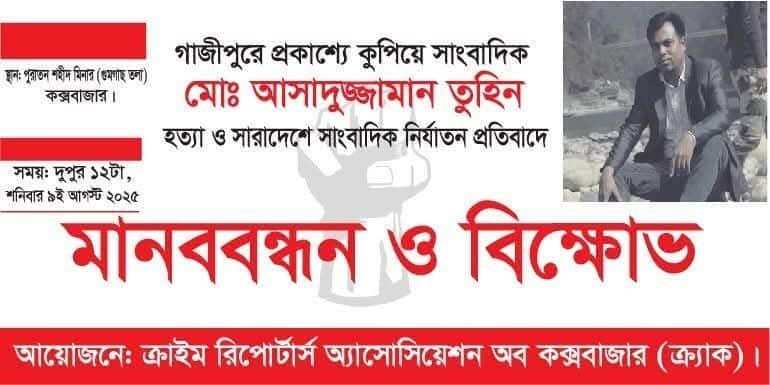 গাজীপুরে প্রকাশ্যে কুপিয়ে সাংবাদিক তুহিন হত্যা এবং সারাদেশে সাংবাদিক নির্যাতনের প্রতিবাদে মানববন্ধন ও বিক্ষোভ সমাবেশের আয়োজন করেছে ক্রাইম রিপোর্টার্স অ্যাসোসিয়েশন অব কক্সবাজার (ক্র্যাক)।