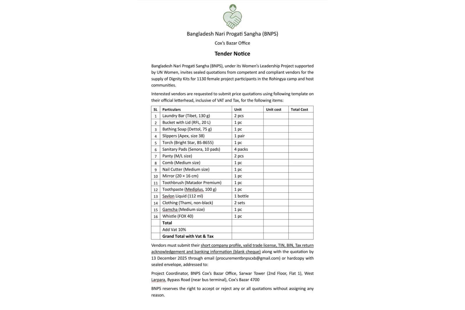 রোহিঙ্গা ও স্থানীয় নারীদের জন্য ‘ডিগনিটি কিট’ সরবরাহে টেন্ডার আহ্বান